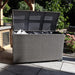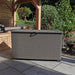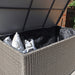 Key features include hydraulic hinges for effortless opening and safe soft-close functionality, a showerproof zipped lining to protect against moisture, and built-in wheels for easy mobility. While designed for storage only, its sleek grey rattan finish seamlessly complements outdoor decor.