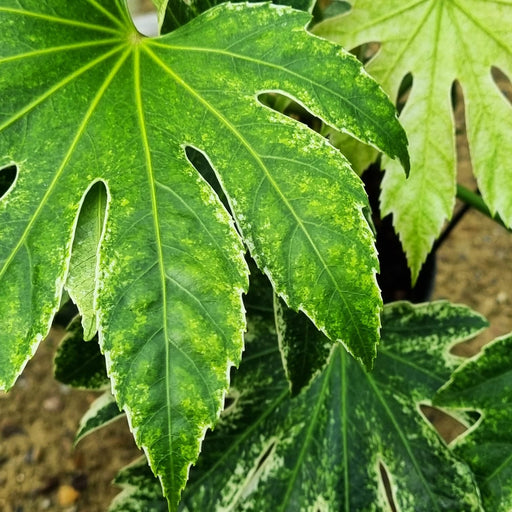 Carpenders Park Garden CentreFatsia japonica ‘Spider’s Web’ is a striking evergreen shrub distinguished by its large, hand-shaped leaves patterned with unique white speckling a...