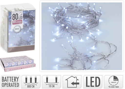 Carpenders Park Garden CentreBring a crisp winter glow to your home with 80 cool white LEDs on silver wire. Spanning 8 metres, these battery-operated lights feature a 6-hour ti...