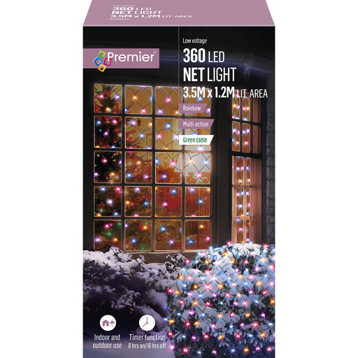 Carpenders Park Garden CentreThis is the Premier 3.5x1.2m 360L Multi-Action Net Light with Rainbow LEDs. It features a green cable and is suitable for both indoor and outdoor u...
