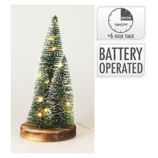Carpenders Park Garden CentreA charming set of three frosted green trees on a rustic wood-style base, softly lit with warm white LEDs. Battery operated with a 6-hour timer. Per...