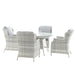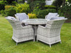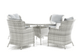 The Capri dining set is perfect for garden dining. The modern colour and rust proof aluminium frames make for a great set that prioritises comfort and style with its high back chairs and sleek design. Capable of seating four guests.