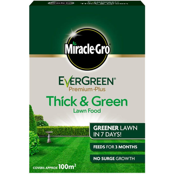 Miracle-Gro EverGreen Premium Plus Thick & Green Lawn Food is a high quality slow release fertiliser for use throughout The growing season. It provides deep uniform greening while slowly feeding your lawn and The lawn stays thicker and greener for months without surge growth. Guaranteed fast greening in 7 days.