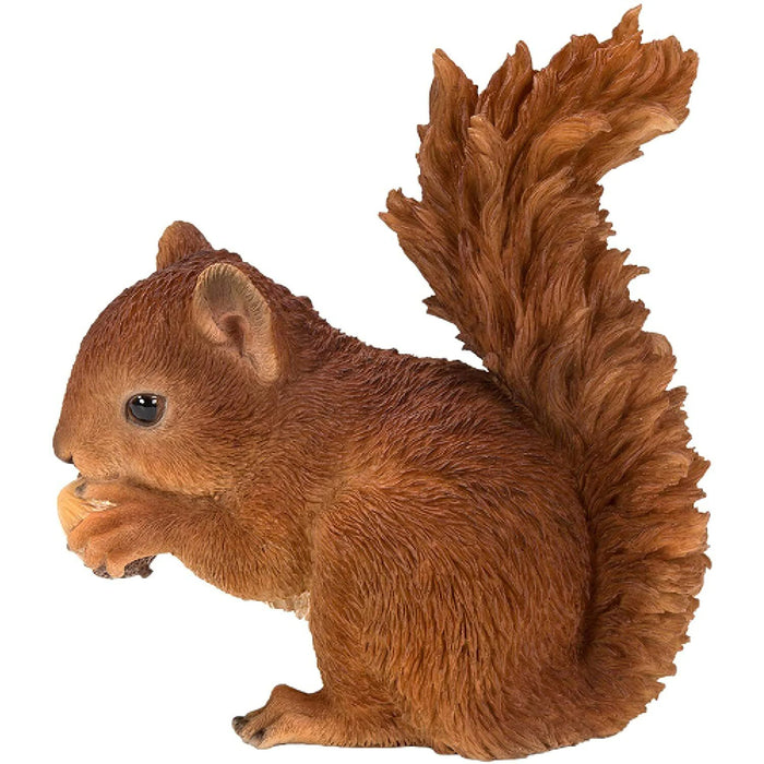 The Vivid Arts RL Baby Red Squirrel is a beautifully crafted resin ornament, designed with lifelike details and hand-finished for a realistic appearance. Measuring 13.5 cm (L) x 7.2 cm (W) x 15.2 cm (H), it features captivating lifelike eyes and is both frost-resistant and durable, making it ideal for outdoor use. This charming piece is perfect for adding a touch of woodland magic to your garden or home decor.